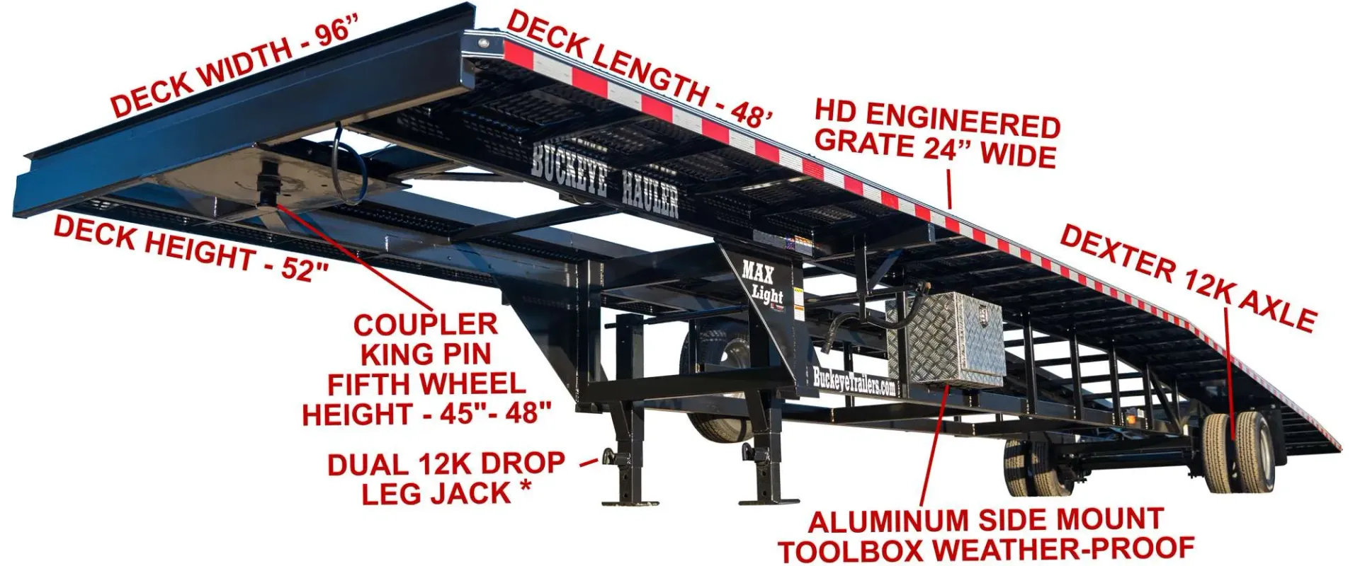 - Coupler – King pin with a fifth wheel height of 45″ to 48″